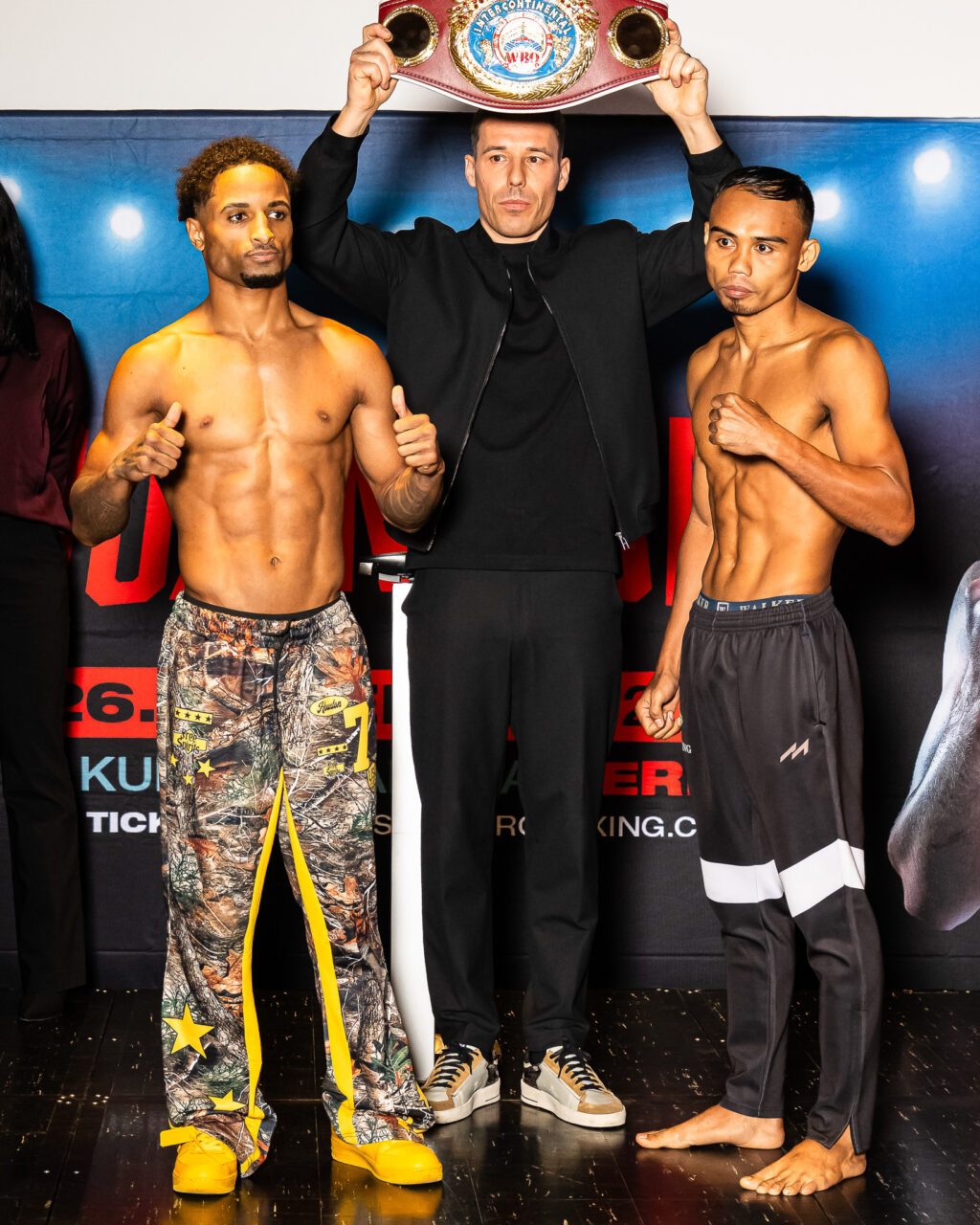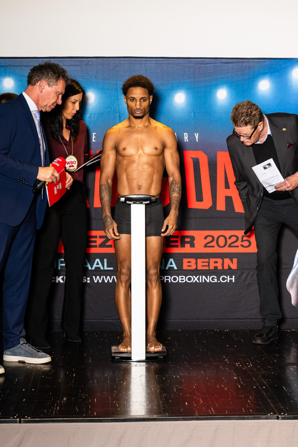 Beim offiziellen Wiegen lag viel Spannung in der Luft. Die Boxerinnen und Boxer, insbesondere die der Hauptkämpfe präsentierten sich fokussiert und in Bestform und bereit für die richtungsweisenden Duelle am Boxing Day 2025. Mouafos Kampf fällt kurzfristig aus.